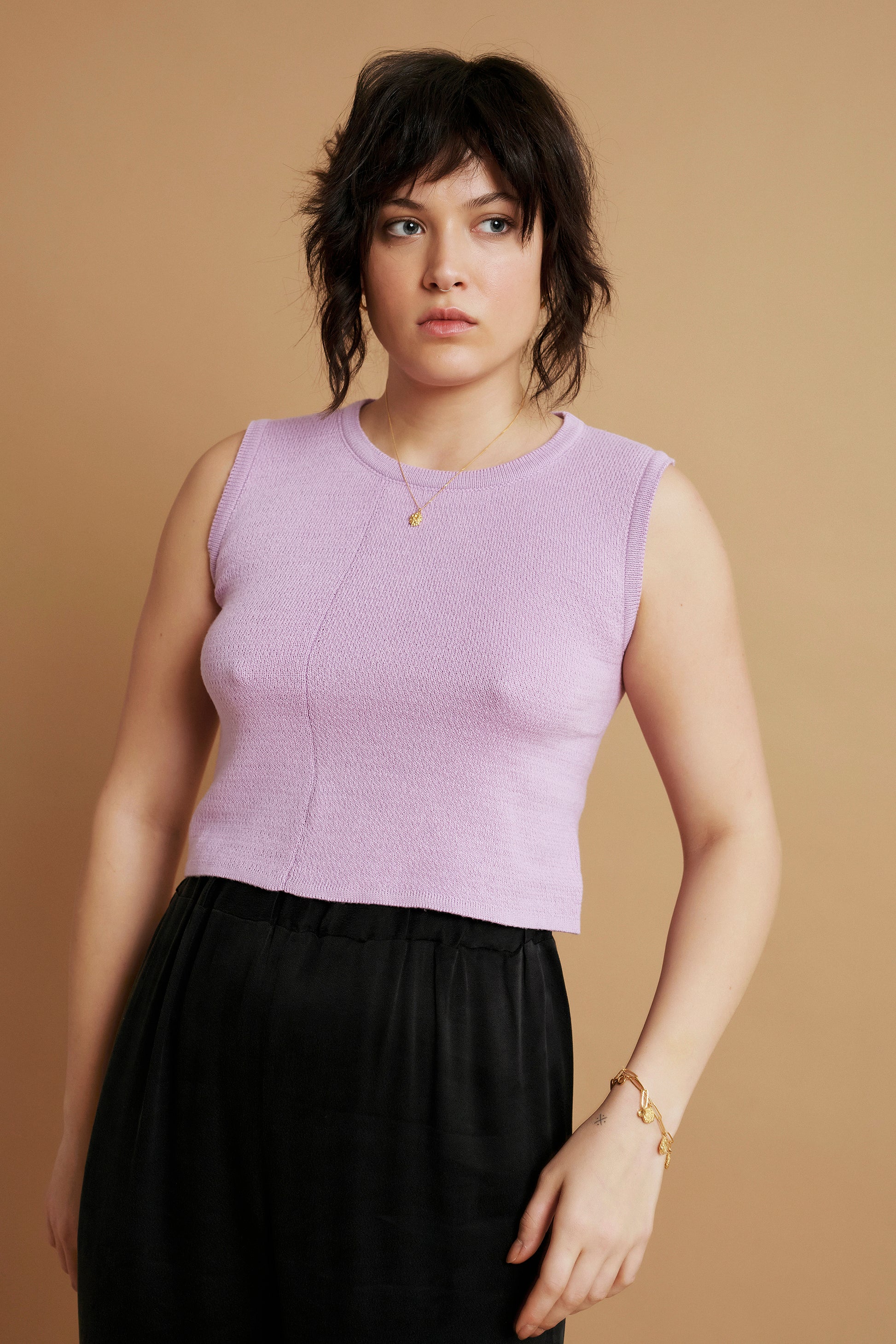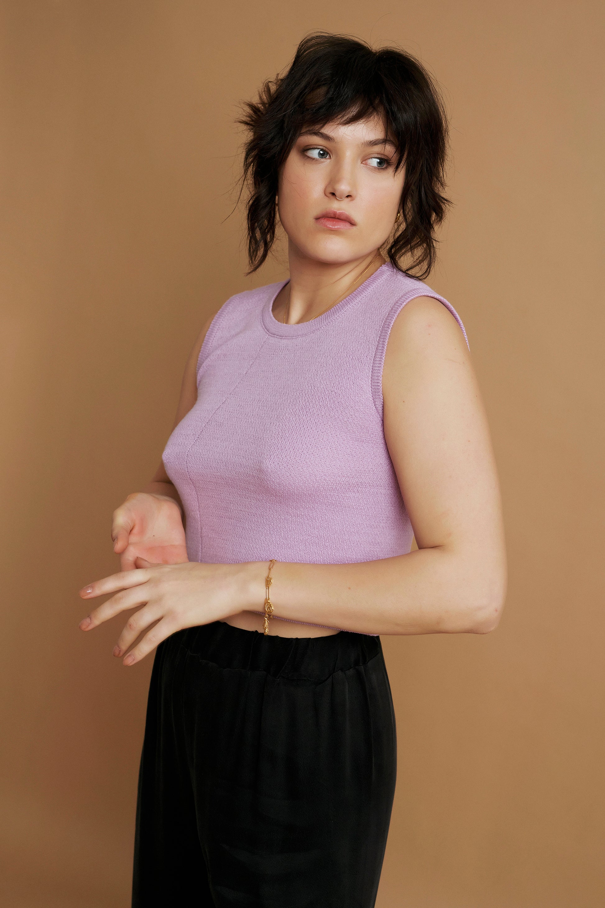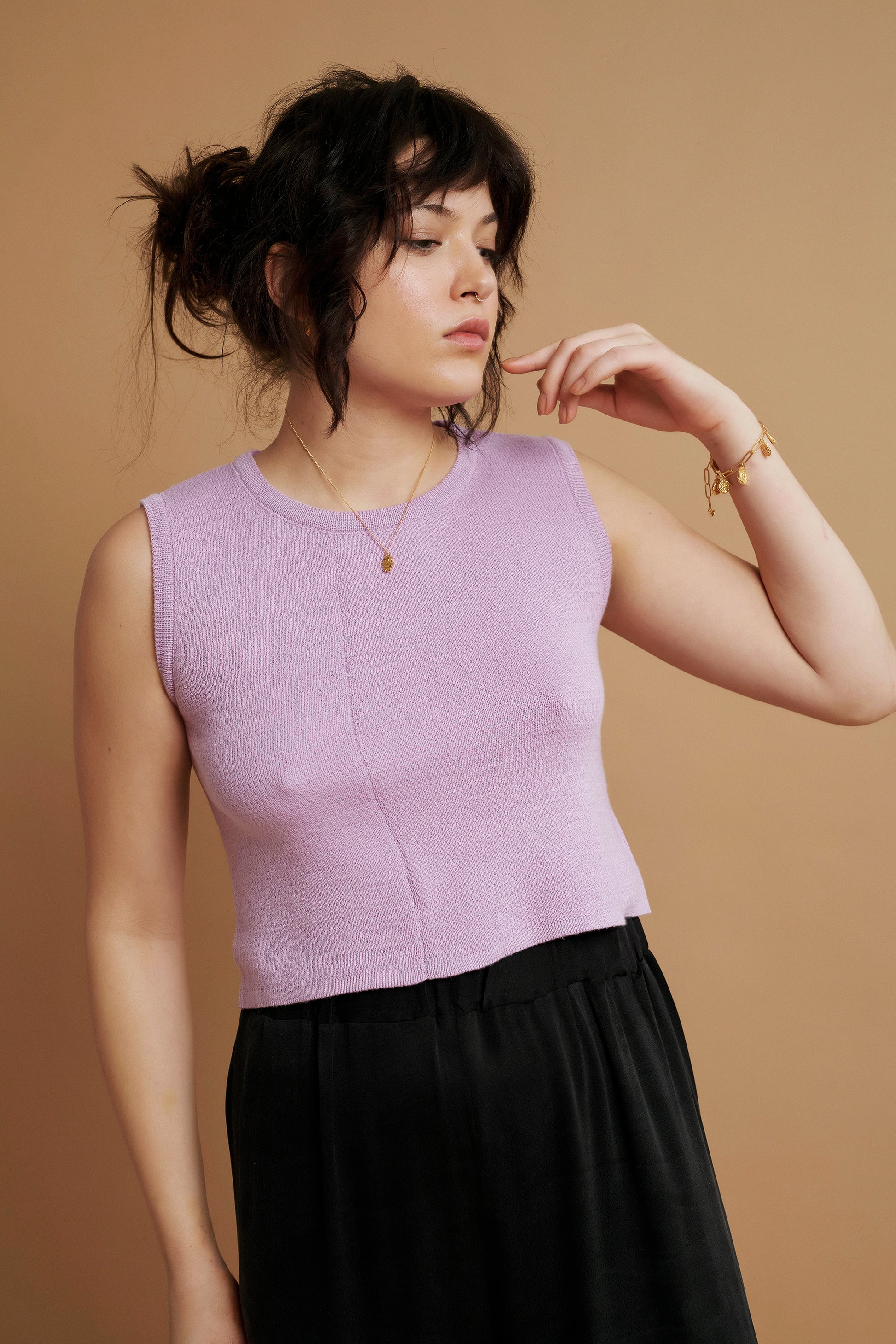 KALI is a lightweight knitted crop tank top with a scoop neck. It is perfect for warm days to wear it simple as a top or on top of a shirt as a vest during colder days.
