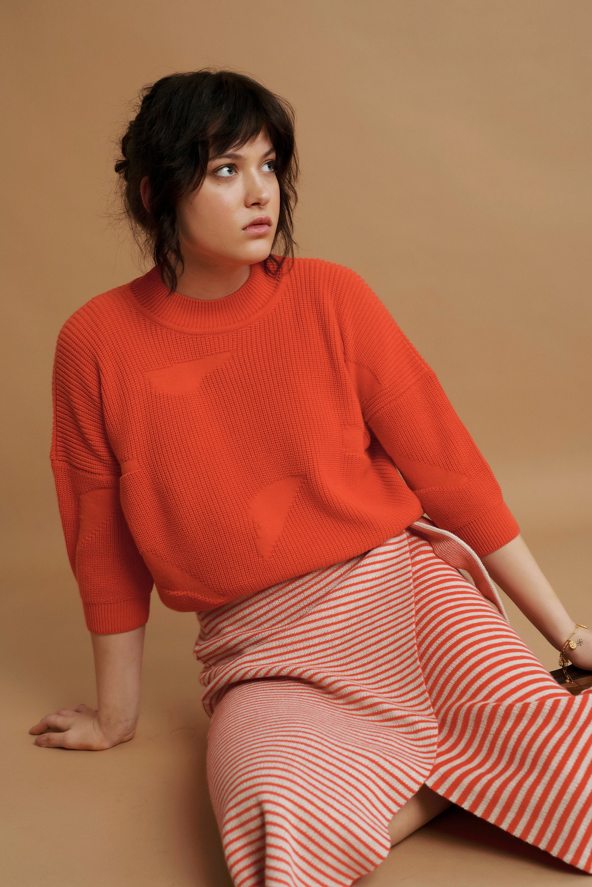 The loose fit, round neckline, 3/4 sleeves and the soft organic cotton yarn makes NOAMI a cool and comfy knit. It has a unique pattern that gives an extra special character to it.