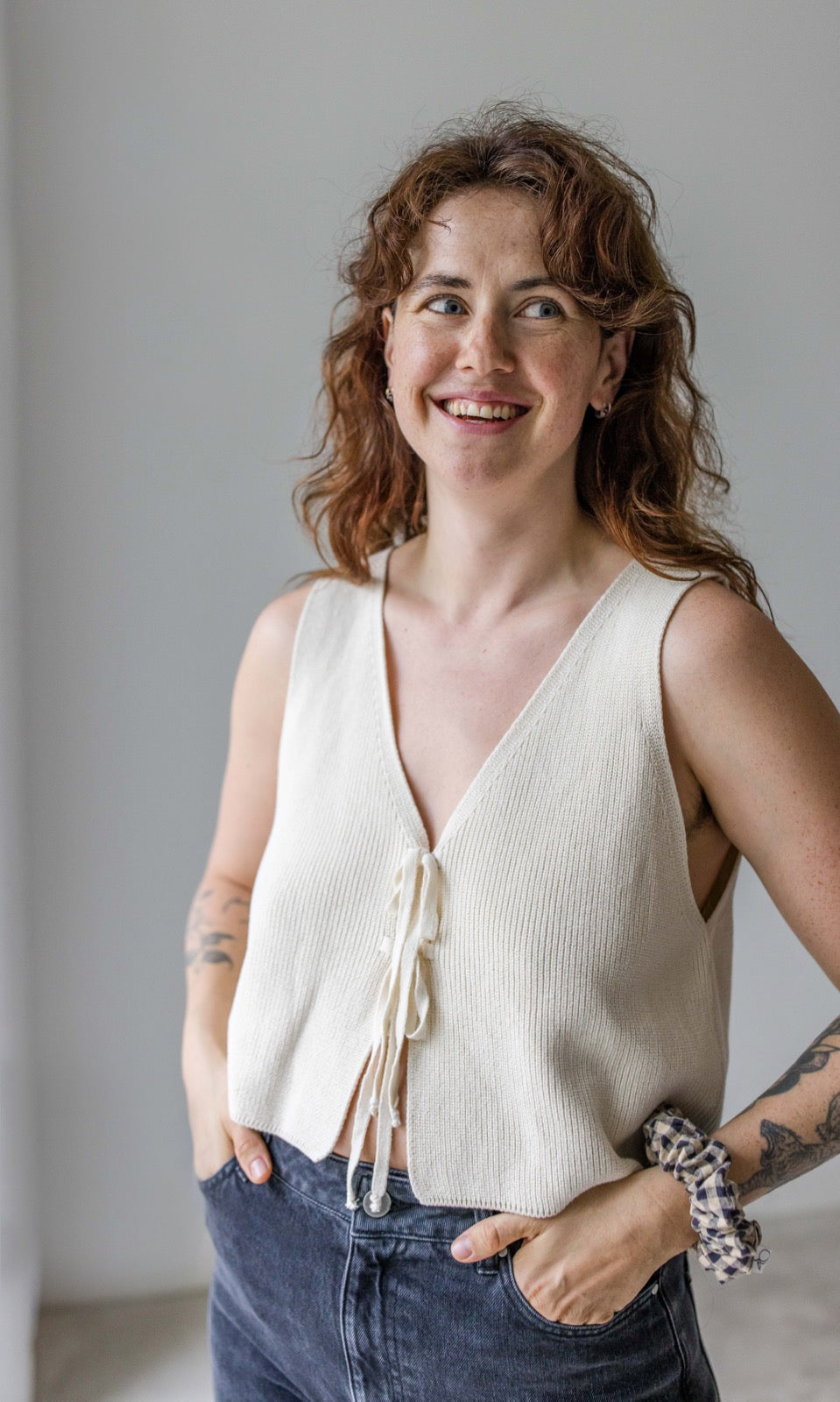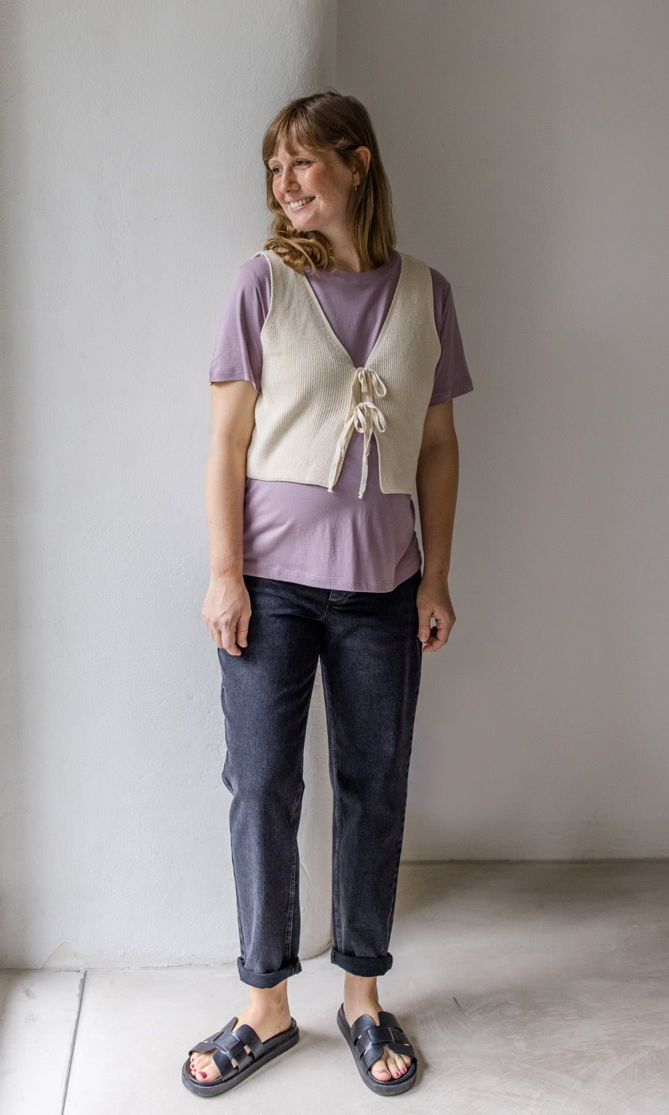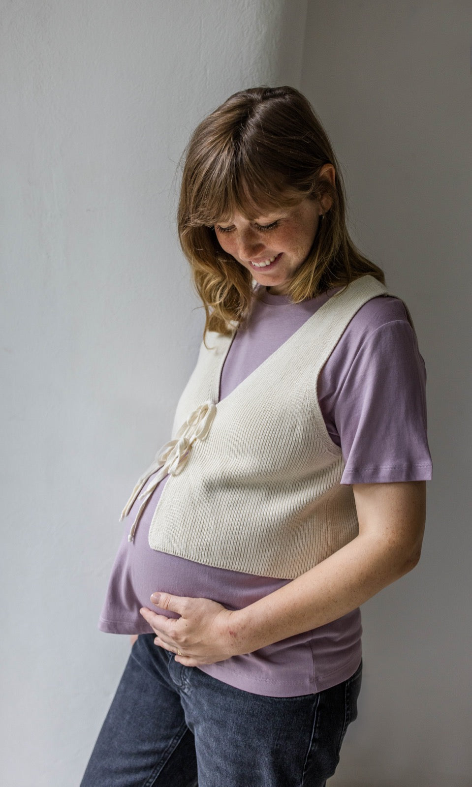 This wonderful knitted top, made from soft organic cotton, was created in collaboration with abricot coco. Together, we designed a unique cut and had it produced in small quantities at a family-run textile workshop in Hungary. The bow details and the exceptional knitting pattern make this vest a truly special favorite piece. We designed the limited top in the colors cream, basil, and lilac.