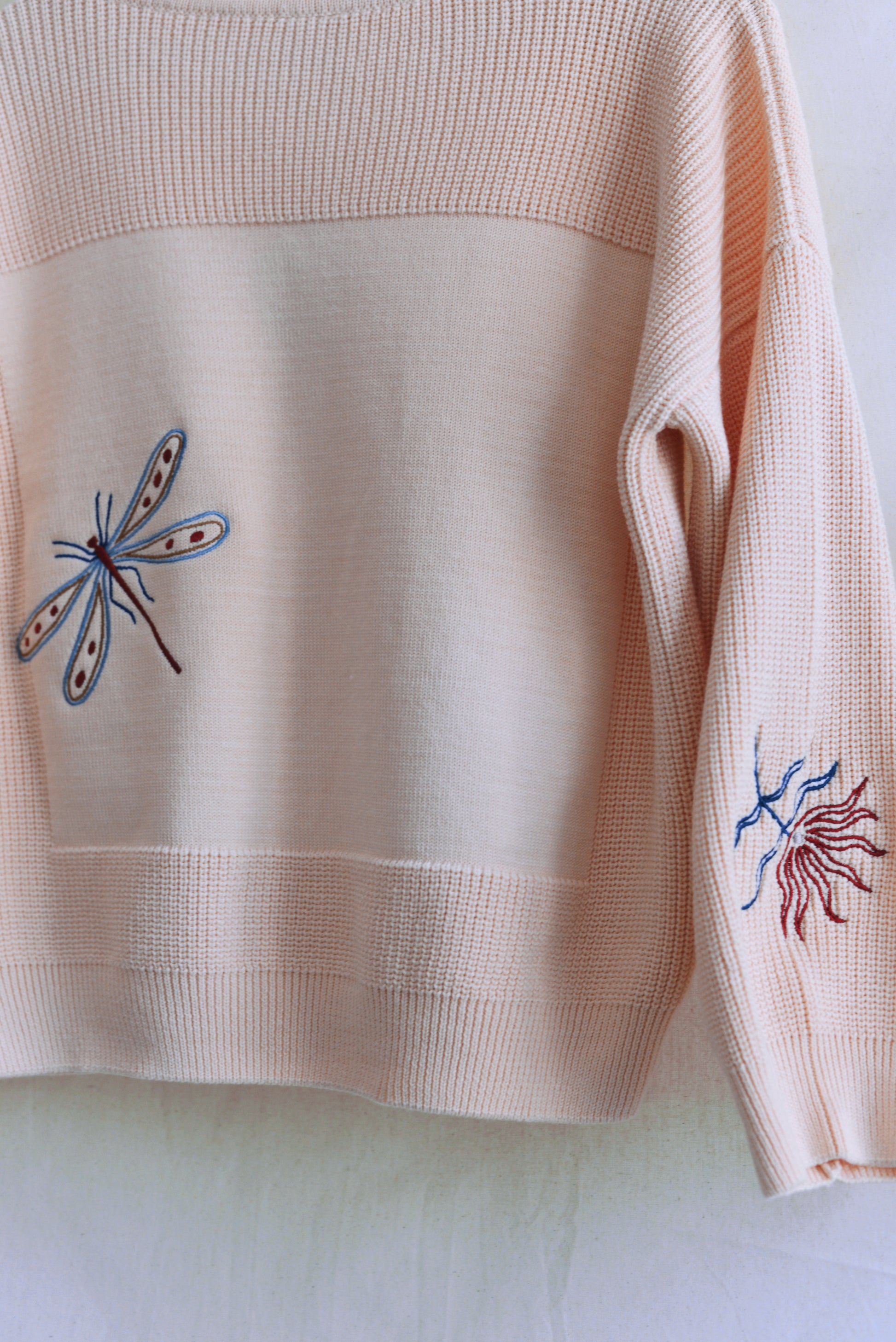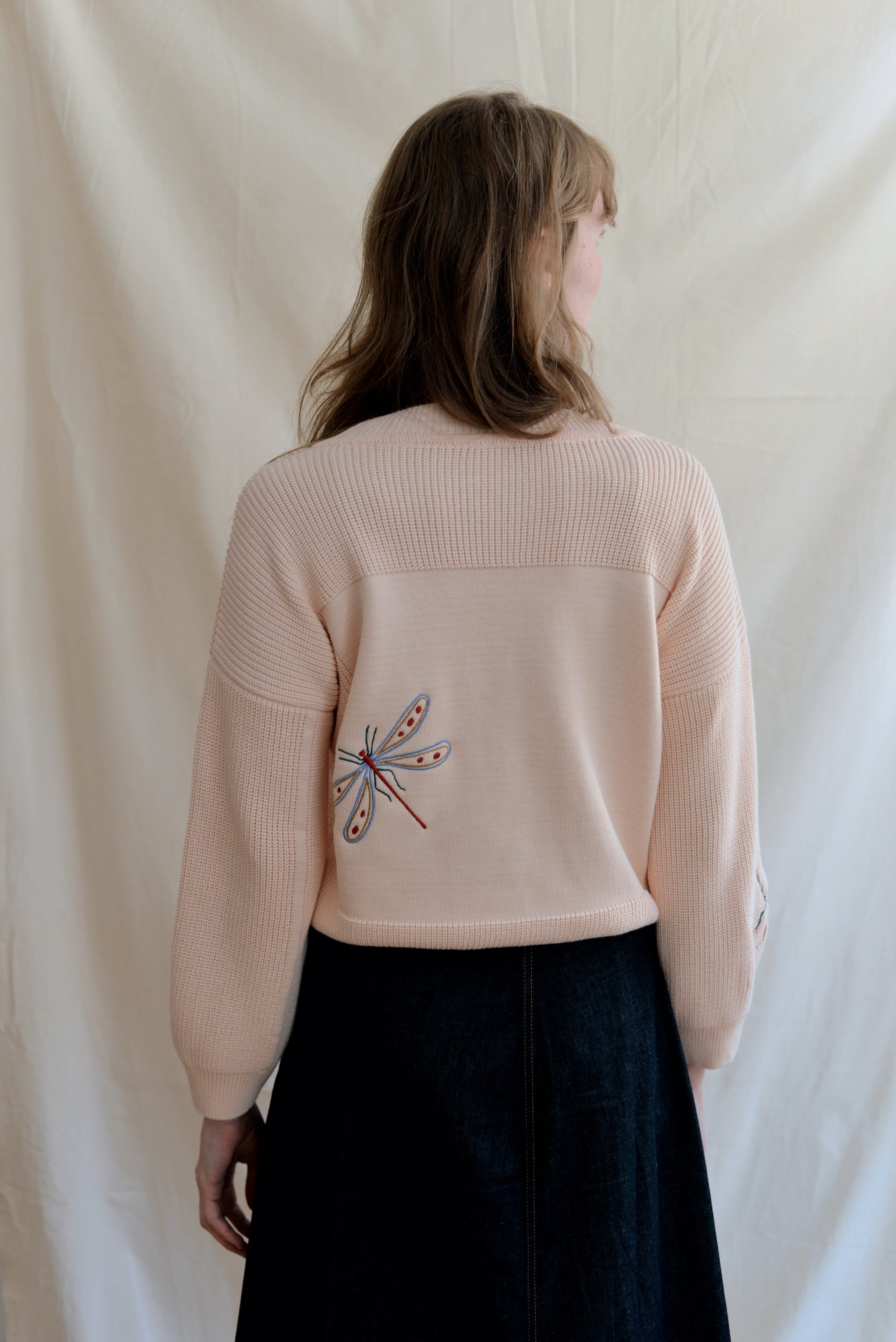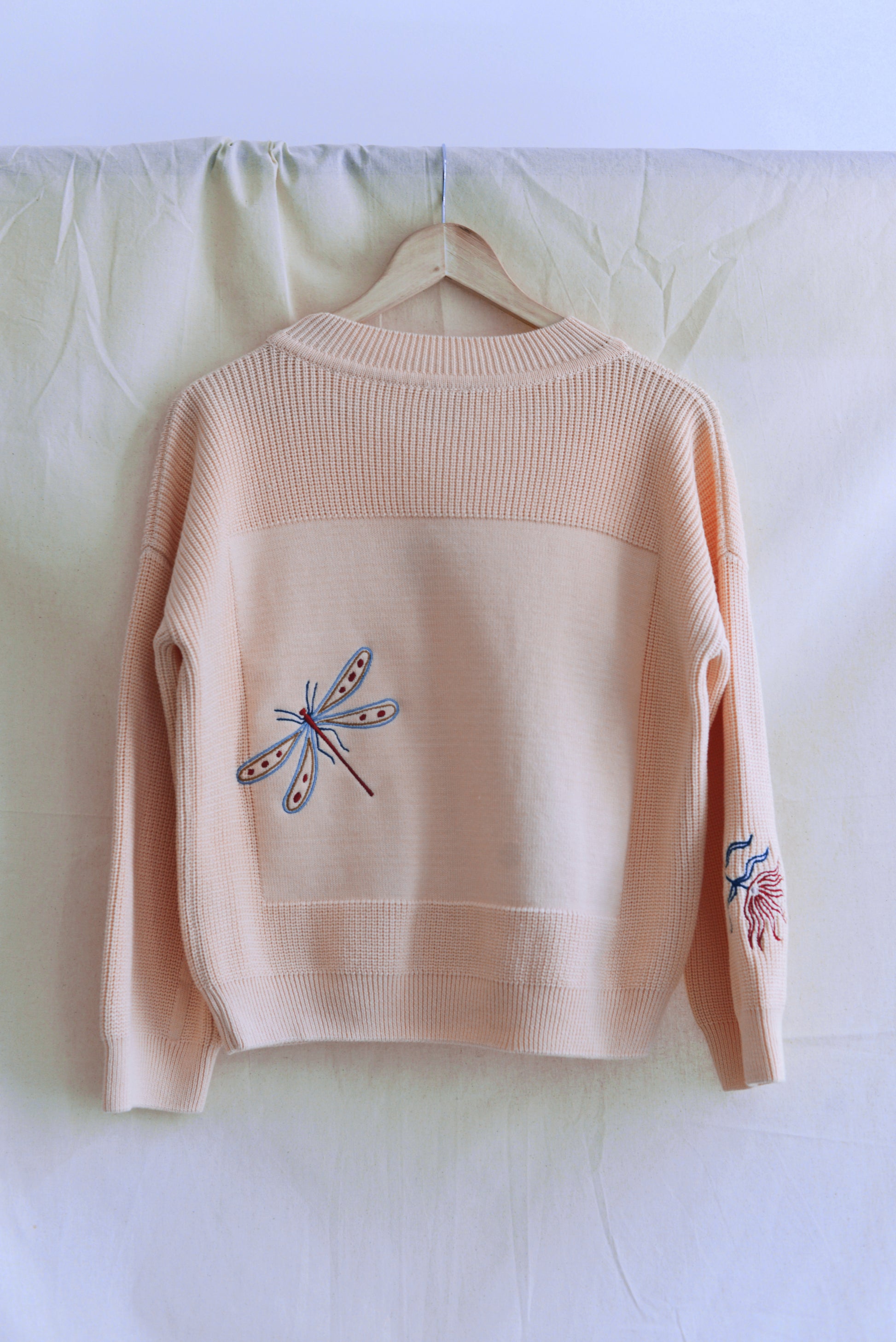 Madeleine infused our staple MOA jumper with three distinct emroidered elements in her signature style — a sun, a dragonfly, and a flower—skillfully scattered throughout the design. Her choice of light and rust colors harmoniously align with her natural visual world.
