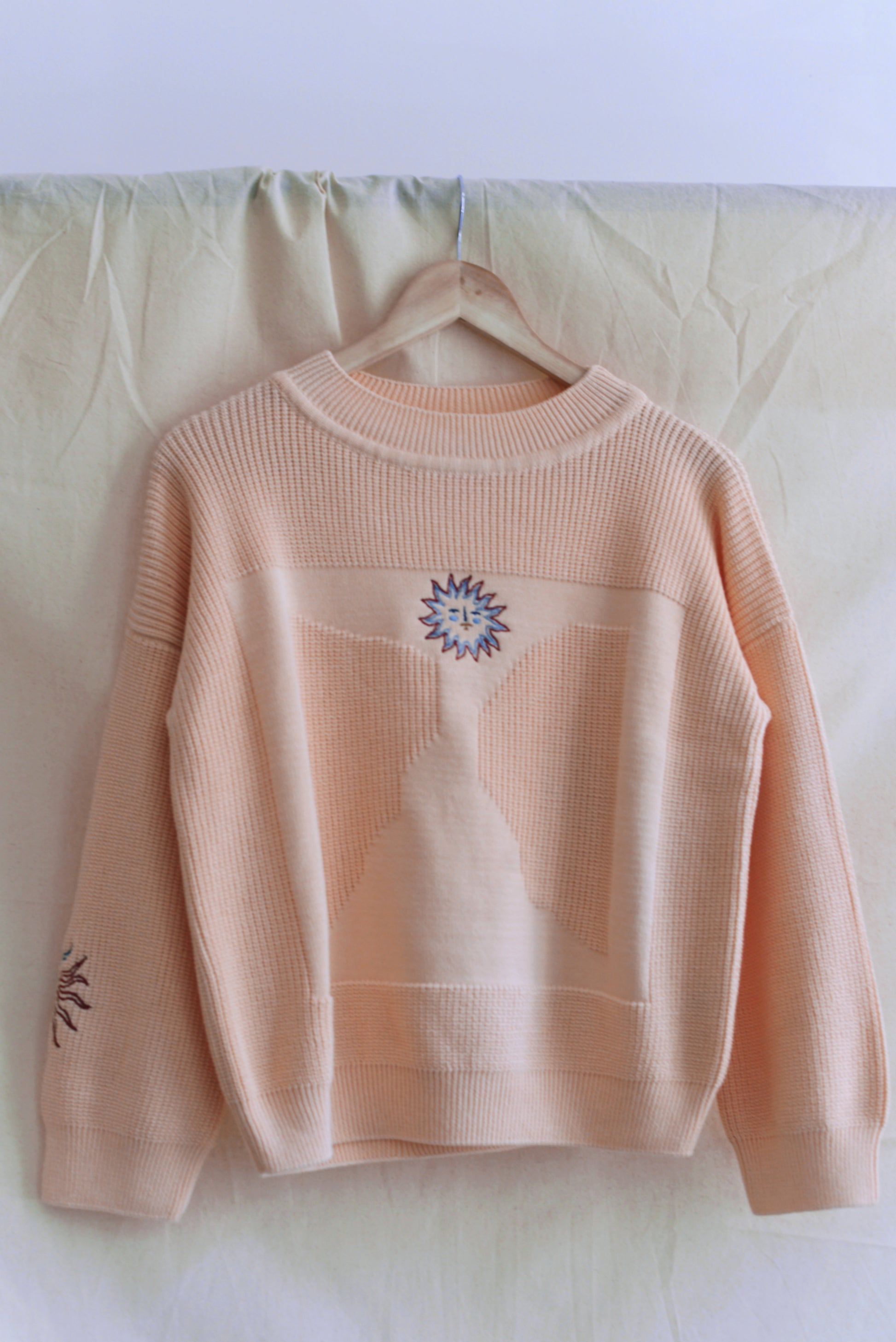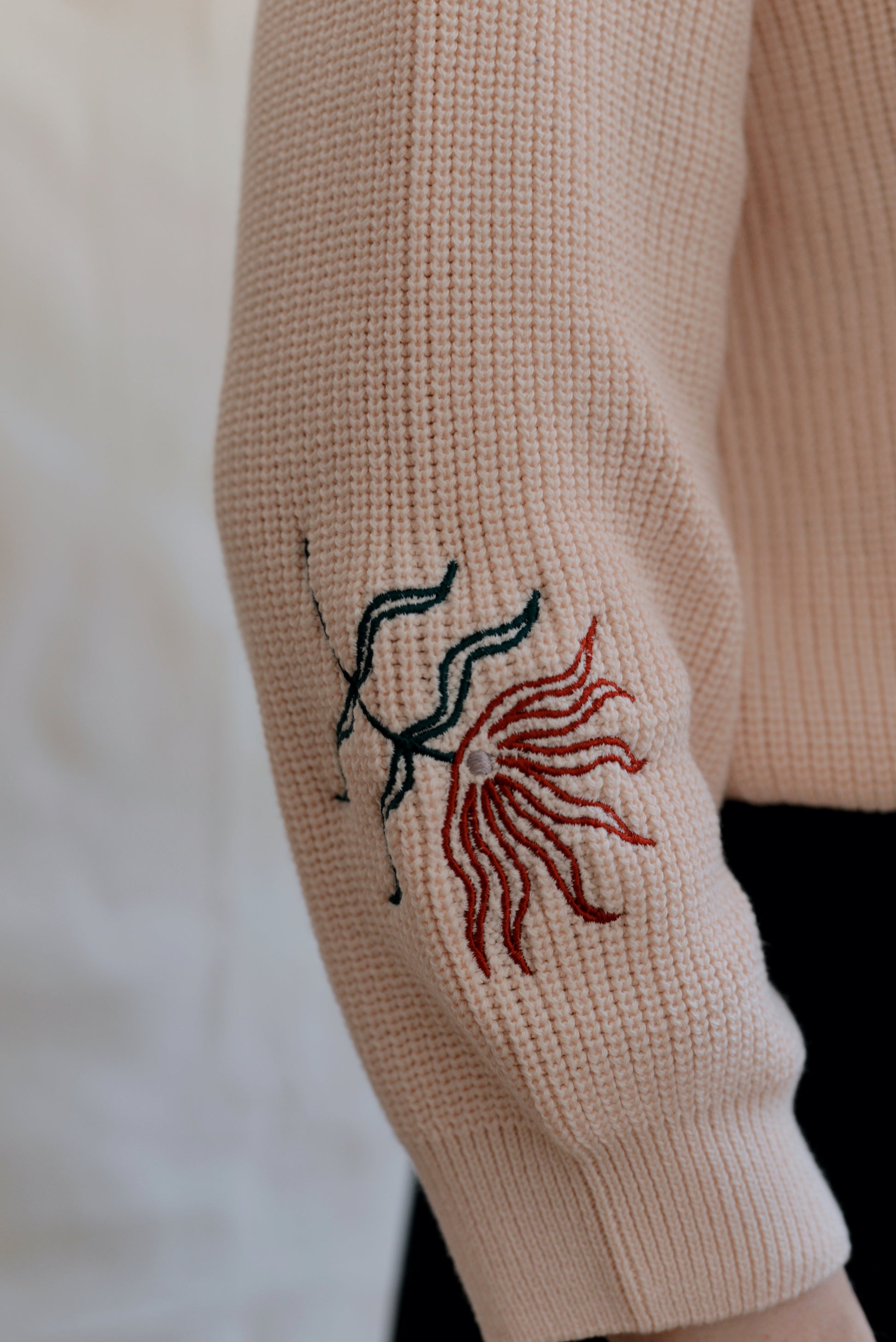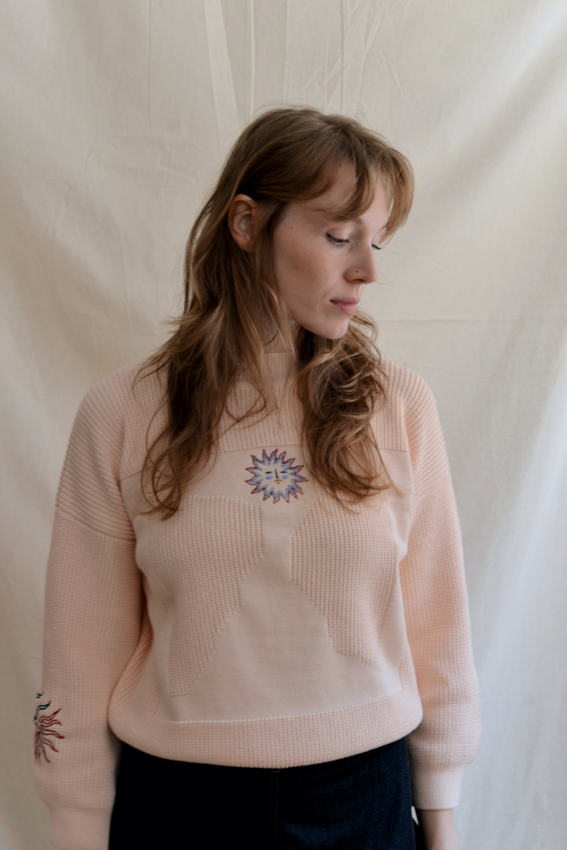 Madeleine infused our staple MOA jumper with three distinct emroidered elements in her signature style — a sun, a dragonfly, and a flower—skillfully scattered throughout the design. Her choice of light and rust colors harmoniously align with her natural visual world.