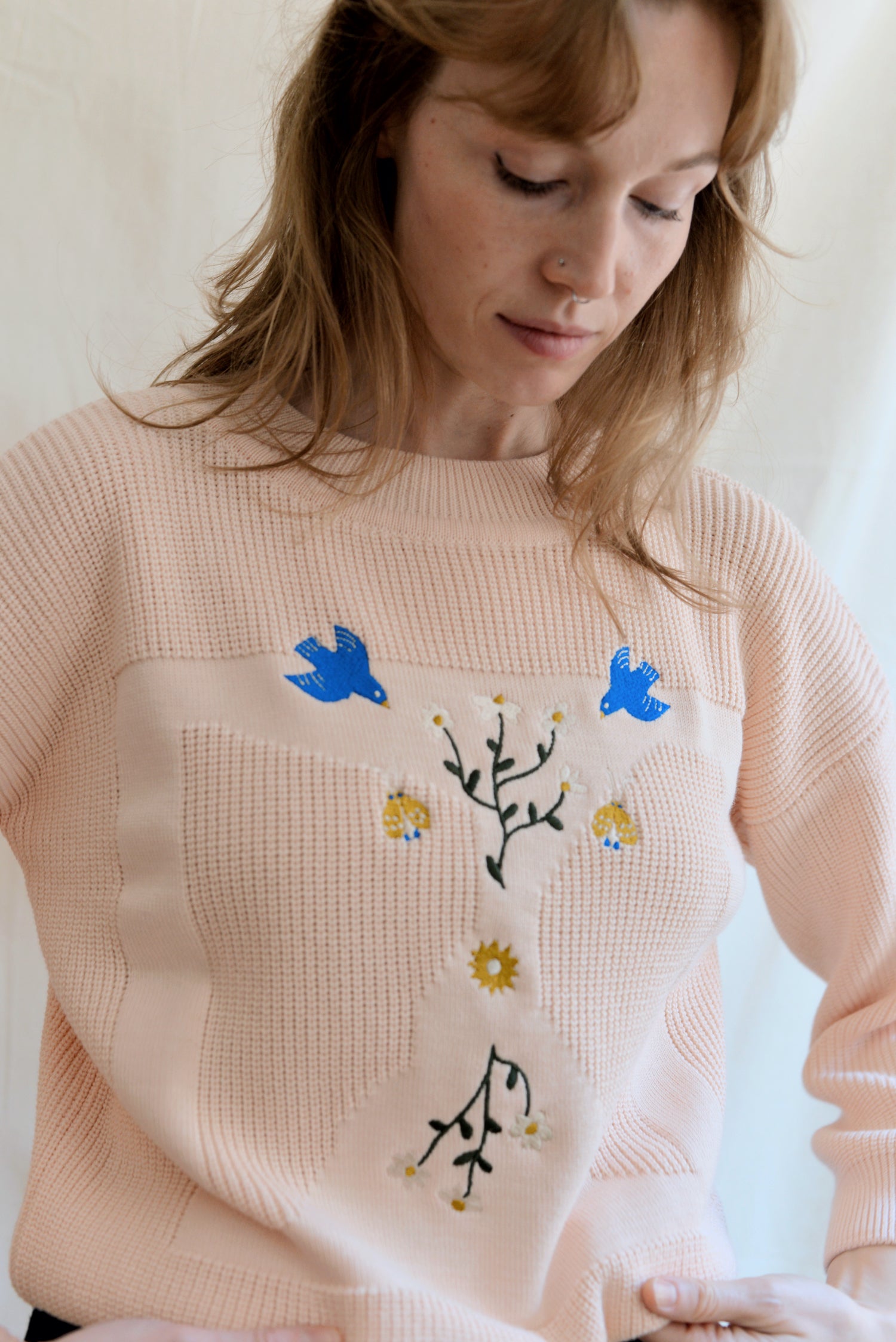 For our collaborative MOA jumper, Sarah created a whimsical landscape filled with birds, insects, and flowers, bringing a playful, feminine touch that complements the jumper's textured design. The hues of wine, light & lotus she selected beautifully echo the visual essence of her design.