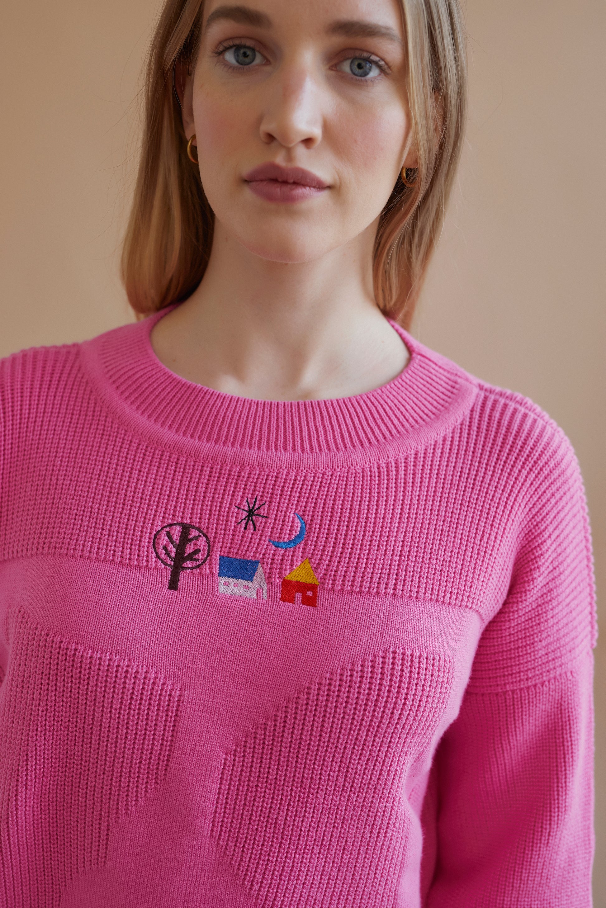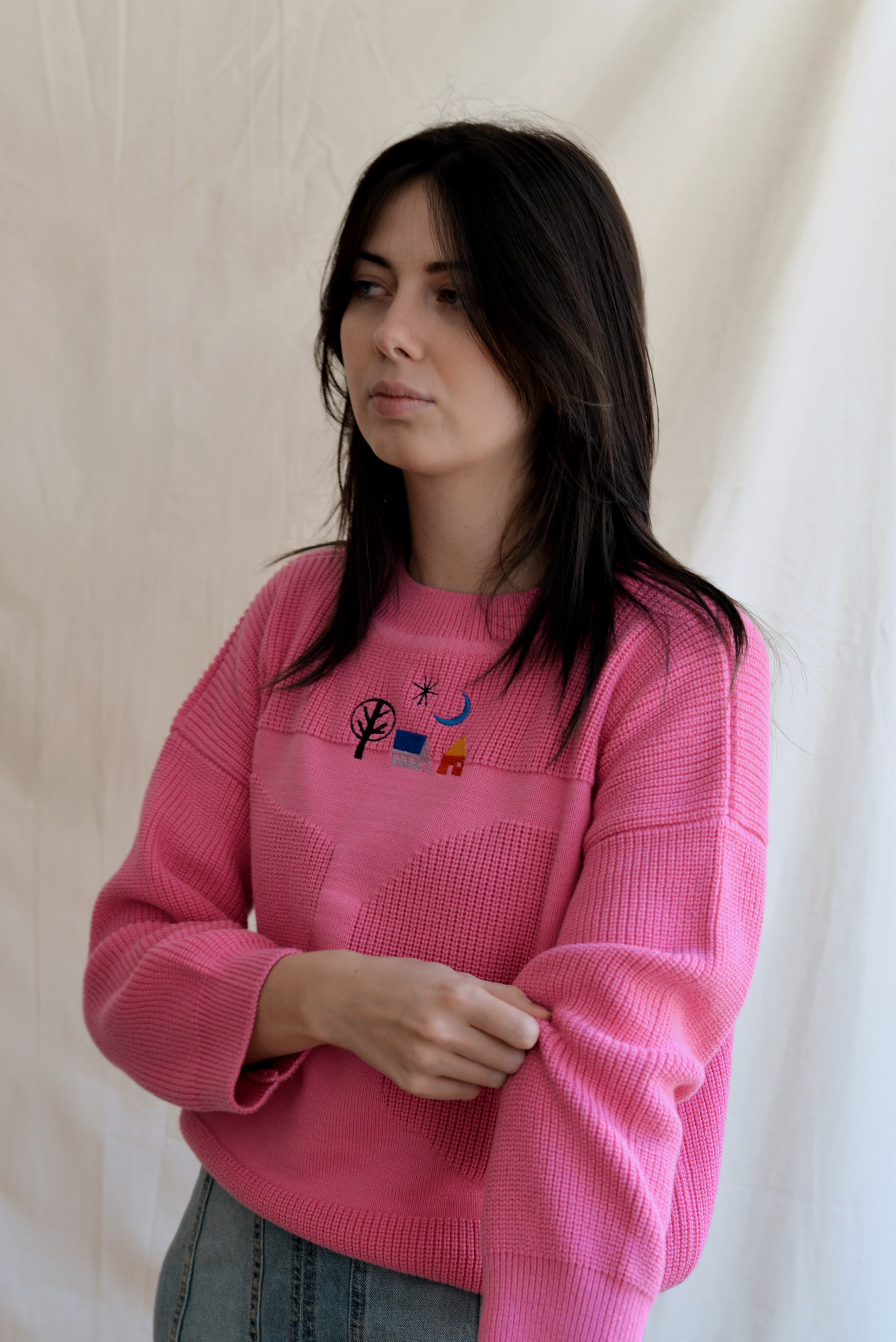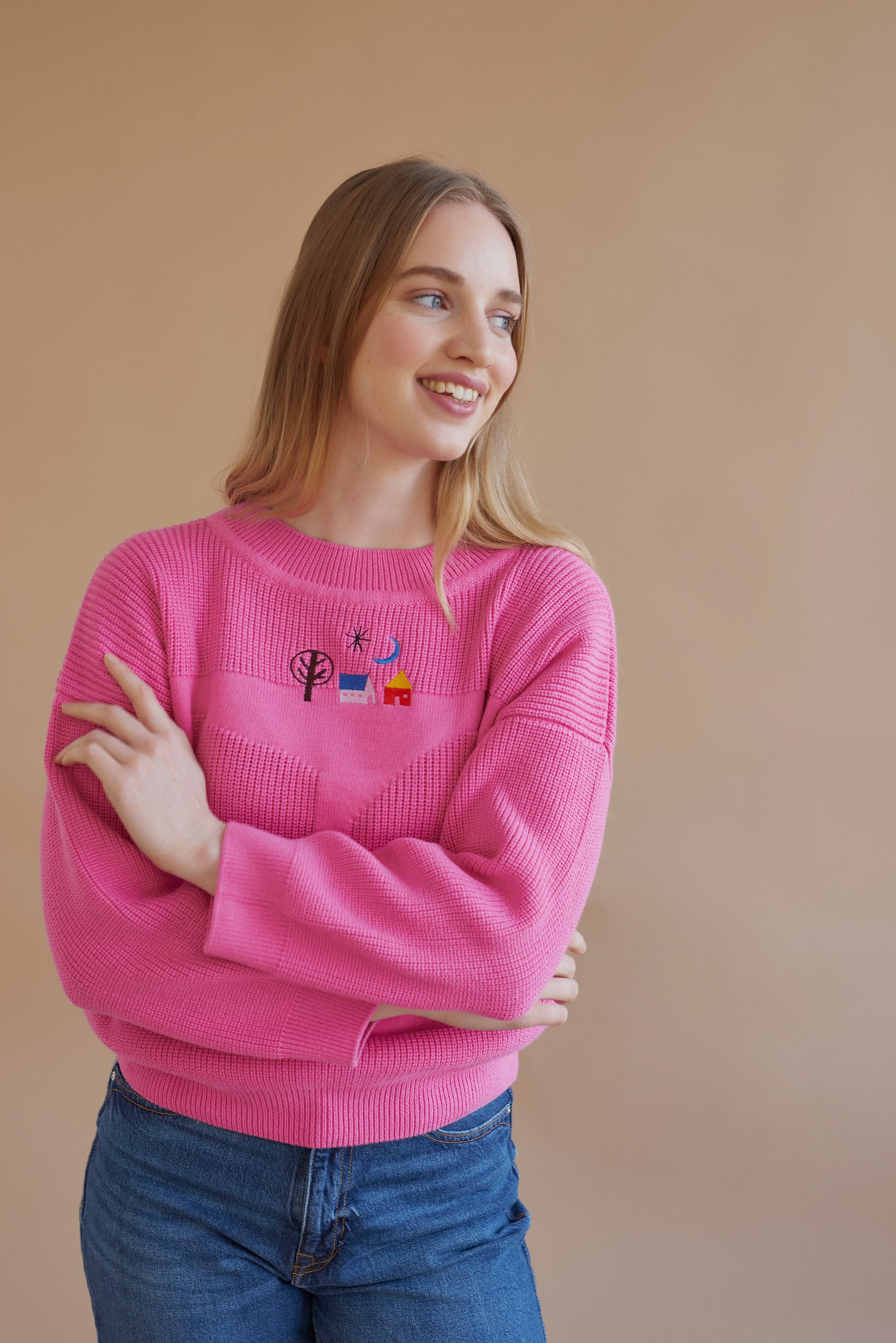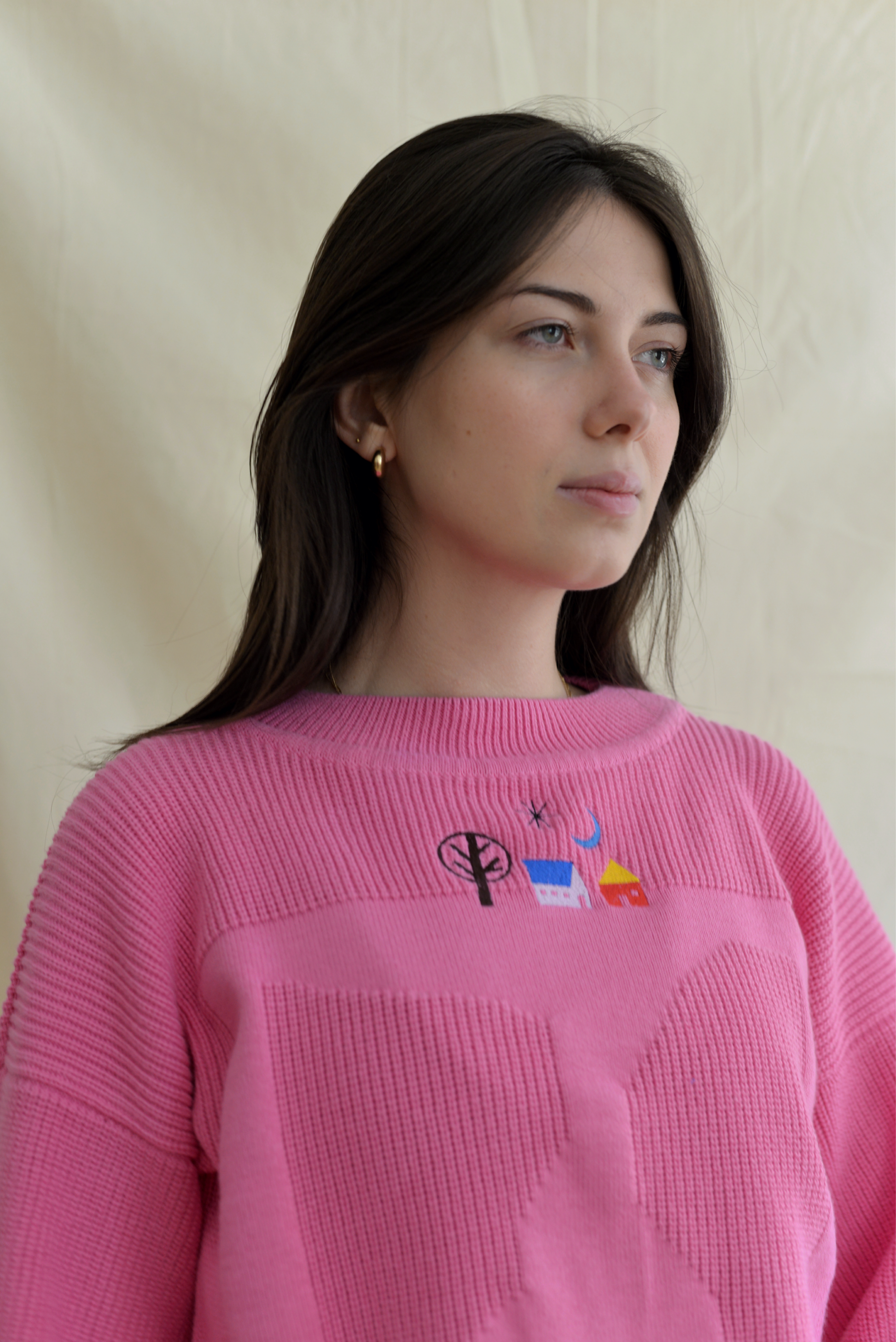 For our collaborative MOA jumper, Lea designed a captivating night-time landscape featuring a small village with houses and trees, presented in her signature visual style at the center of the piece. Her chosen color palette perfectly reflects her distinctive world of hues, creating a harmonious and dreamy aesthetic.